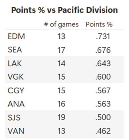 The Kraken are second in points percentage in games against Pacific Division opponents and have two more divisional games before the break.