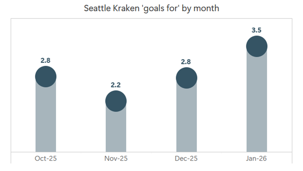 McCann’s return was the shot in the arm they needed. He has 11 goals in 19 games since coming off IR in late December, tied for sixth in the league over that span. Matty Beniers is also on a heater with 10 goals in January, a number McCann matched one game later. Beyond those two, Berkly Catton chipped in five goals, and Jordan Eberle added five of his own during the month.