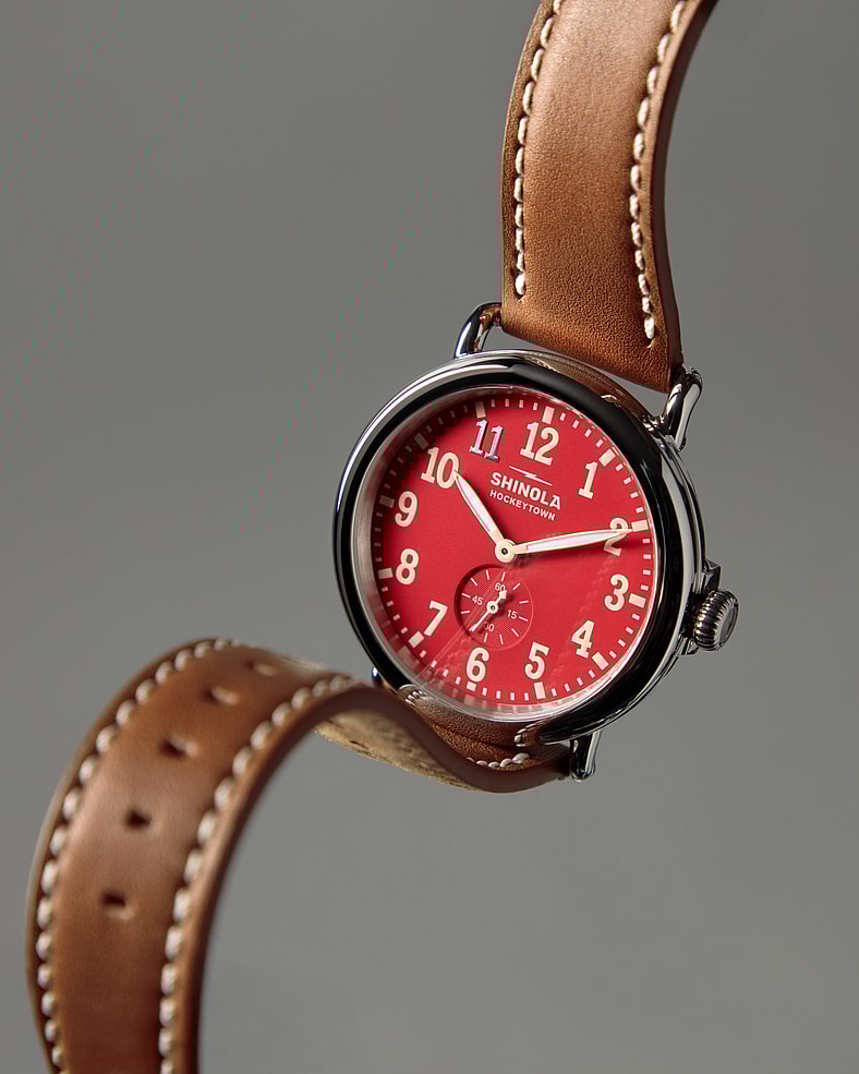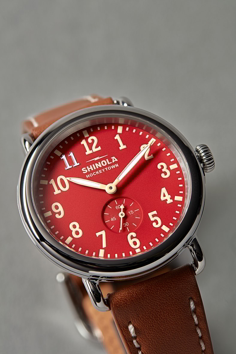 The Shinola x Detroit Red Wings Centennial Runwell boasts the brand’s classic 41mm case design and a fiery red dial, plus cream-hued indices and numerals, all in honor of the famed hockey franchise.