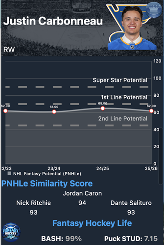 The appeal here is timing. Carbonneau’s pNHLe via the Rank King application has been somewhat muted this season, which may be partially explained by his increased focus on rounding out his all-around game rather than purely chasing offense. That dip in projection could create a buying opportunity if managers anchor too heavily to the headline number. The underlying trajectory still supports top-line upside if his offensive confidence and play-driving continue to translate. For dynasty managers, this is the type of asset worth acquiring before production, deployment, and perception realign and close the value gap.