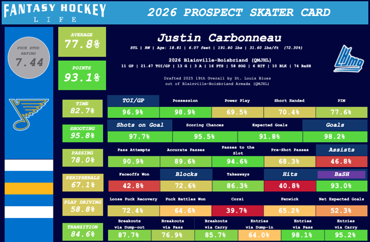One of the longstanding knocks on Carbonneau has been his two-way consistency, but that area of his game has taken a meaningful step forward this season. His Fantasy Hockey Life skater card reflects improvement across several key areas, most notably in loose puck recoveries, puck battles won, play driving, and transition impact. Those gains suggest a player who is learning how to influence play away from the puck, not just finish it. In addition, Carbonneau offers strong contributions in peripheral categories such as shots, hits, and blocks, giving him a higher floor than many offense-first wingers.