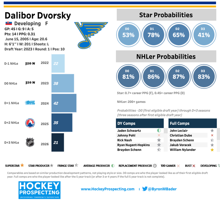 Dvorský is a legitimately strong offensive player, and the recommendation to sell has nothing to do with doubts about his scoring ability. He graduated the Hockey Prospecting model with a 41% chance of becoming a star, and his early NHL usage has already translated into tangible results, nearly 10 power-play points in just over half a season. His processing with the puck, ability to find space, and comfort in offensive situations all point to a player who should produce at the NHL level, particularly on the man advantage.