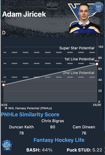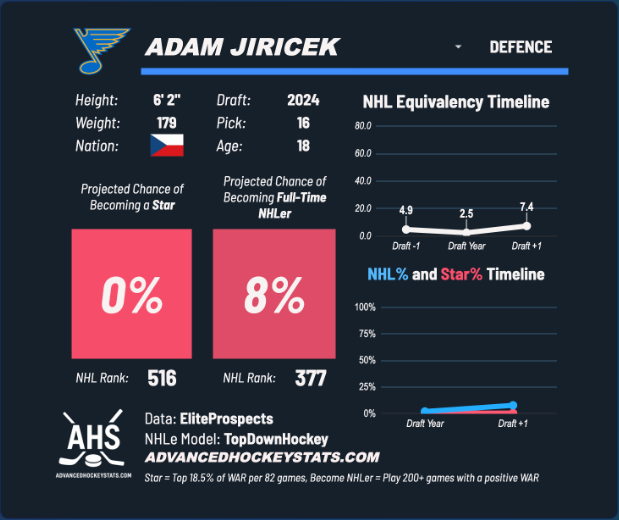 The uncertainty surrounding his profile is exactly what makes this a buying opportunity. His Advanced Hockey Stats card assigns him a zero percent chance of becoming a star, largely driven by limited scoring during his draft-minus-one and draft-year seasons when injuries significantly disrupted his development. That context matters. Those early seasons are heavily weighted by the model, but they do not reflect the player Jiricek is now. Showing that card to the current manager may even help soften acquisition cost, especially if they are risk-averse or model-driven.