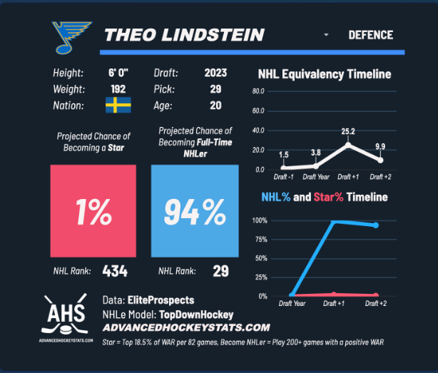 The data reinforces that divide. Lindstein’s Advanced Hockey Stats card assigns him just a one percent chance of becoming a star, while giving him a 94% probability of becoming a full-time NHL player. That is exactly the profile he fits. He is very likely to play meaningful NHL games and be trusted in defensive situations, but that usefulness is far more valuable to his team than to your fantasy roster. If another manager is valuing him as a future top four fantasy contributor based on role security alone, this is a strong window to sell. His NHL future looks stable, but his fantasy ceiling likely remains modest unless his offensive involvement changes dramatically.