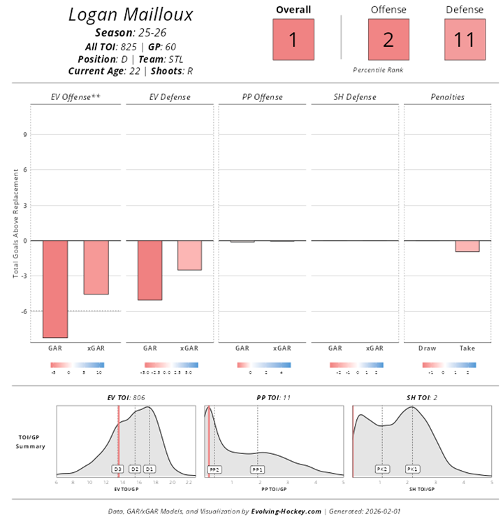 The limitation lies on the other side of the puck. Dvorský has long been a defensive liability, and that concern has carried over to the NHL. Evolving Hockey grades his defensive impact in just the 33rd percentile, and within the Blues lineup he ranks near the bottom in both Corsi against per 60 minutes and expected goals against per 60 minutes. Those deficiencies make it difficult for him to consistently earn the kind of five-on-five usage needed to reach his absolute ceiling. He can still be a productive scorer, but a true top-end outcome becomes less likely if coaches have to manage his minutes carefully. The recommendation here is not to sell cheap, but to capitalize if another manager is valuing him as a pure offensive centerpiece. Targeting returns consistent with a 70 to 80 point forward makes sense while that perception still exists.