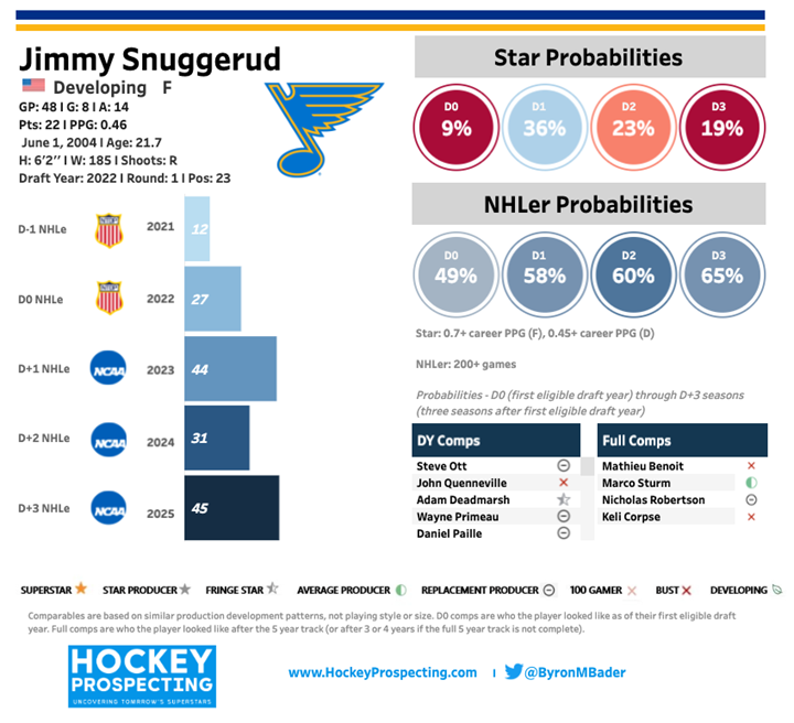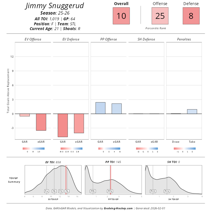 Zooming out, Snuggerud’s long-term outlook remains solid. According to Hockey Prospecting, he graduated the model with a 19% chance of becoming a star, a meaningful signal for a player whose game is built on translatable habits rather than flash. With the remainder of this season and all of next still remaining on his entry-level contract, the Blues have a clear runway to evaluate how he fits into their future plans during a retooling phase. Players who shoot, compete, and contribute on the power play tend to stick sooner than expected. If his role continues to grow incrementally while perceptions lag behind early results, this remains a strong buy window before his value stabilizes.
