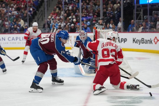 Detroit Red Wings right wing Alex DeBrincat, right, struggles to control the puck as Colorado Avalanche defenseman Sam Malinski, front left, covers in the second period of an NHL hockey game Monday, Feb. 2, 2026, in Denver. (AP Photo/David Zalubowski)