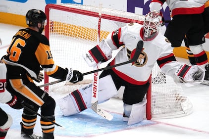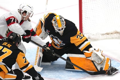 Senators Penguins Hockey Pittsburgh Penguins goaltender Arturs Silovs (37) blocks a shot by Ottawa Senators’ Tyler Kleven (43) during the first period of an NHL hockey game in Pittsburgh, Monday, Feb. 2, 2026. (AP Photo/Gene J. Puskar)