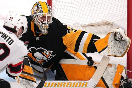 Senators Penguins Hockey Pittsburgh Penguins goaltender Arturs Silovs, right, blocks a shot by Ottawa Senators’ Shane Pinto (12) during the first period of an NHL hockey game in Pittsburgh, Monday, Feb. 2, 2026. (AP Photo/Gene J. Puskar)
