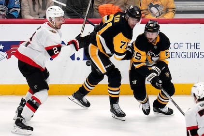 Senators Penguins Hockey Ottawa Senators’ Artem Zub (2) is defended by Pittsburgh Penguins’ Evgeni Malkin (71) and Erik Karlsson (65) during the first period of an NHL hockey game in Pittsburgh, Monday, Feb. 2, 2026. (AP Photo/Gene J. Puskar)