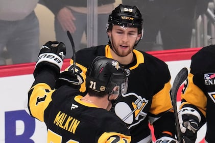 Senators Penguins Hockey Pittsburgh Penguins’ Egor Chinakhov (59) celebrates with Evgeni Malkin (71) after scoring during the first period of an NHL hockey game against the Ottawa Senators in Pittsburgh, Monday, Feb. 2, 2026. (AP Photo/Gene J. Puskar)