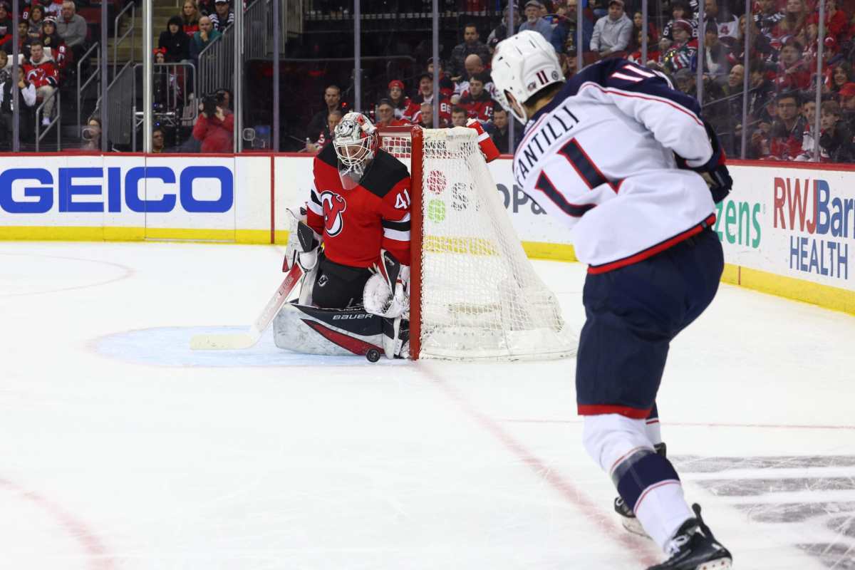 Dec 27, 2023; Newark, New Jersey, USA; New Jersey Devils goaltender Vitek Vanecek (41) makes a save on Columbus Blue Jackets center Adam Fantilli (11) during the first period at Prudential Center. Mandatory Credit: Ed Mulholland-USA TODAY Sports