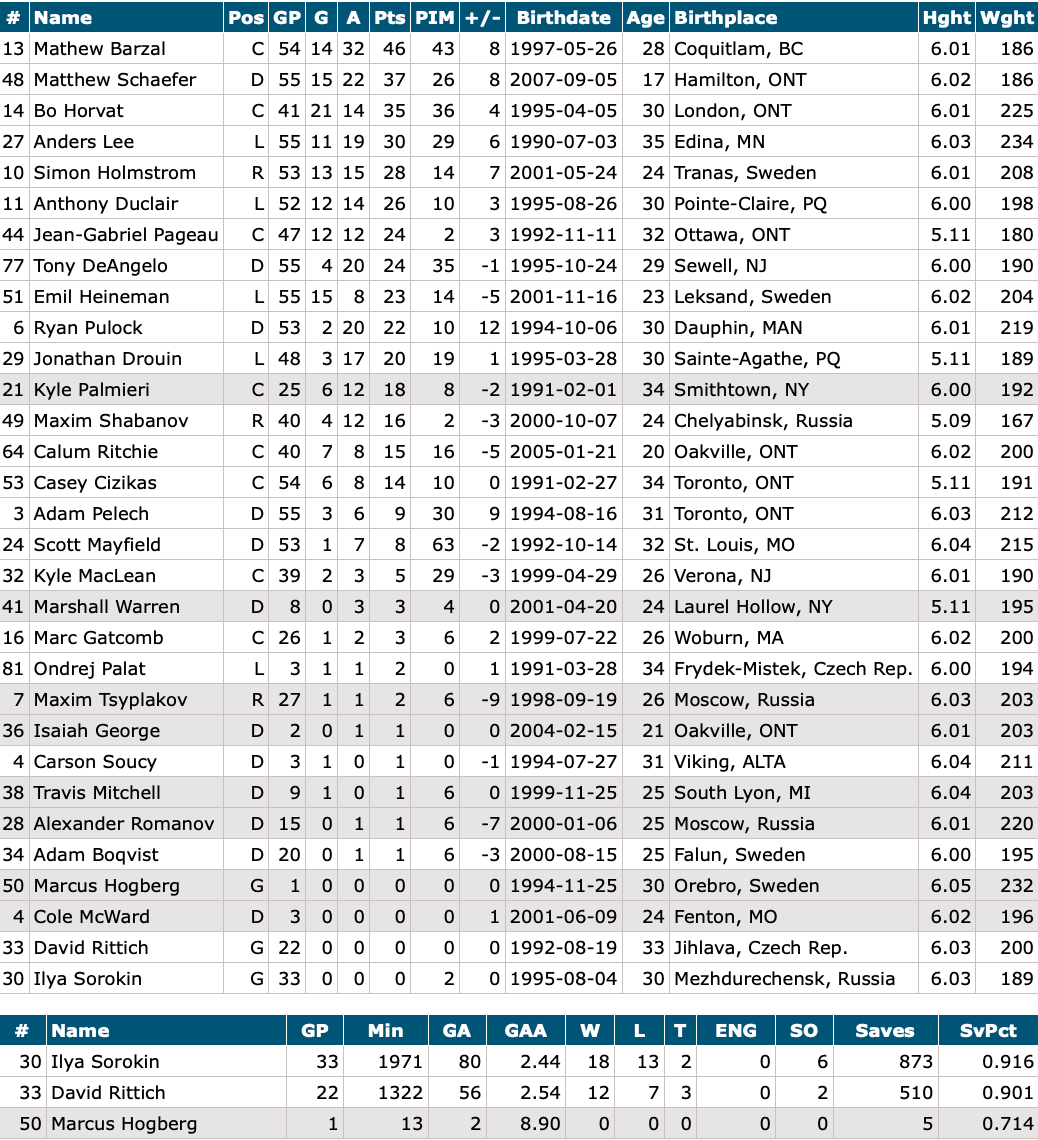 Goalies: Ilya Sorokin (starter), David Rittich