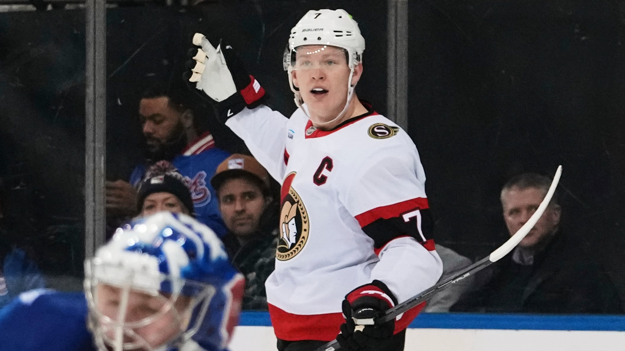 Ottawa Senators’ Brady Tkachuk (7) celebrates after scoring a goal as New York Rangers goaltender Jonathan Quick (32) looks away during the first period of an NHL hockey game Wednesday, Jan. 14, 2026, in New York. (AP Photo/Frank Franklin II) (Frank Franklin II/AP)