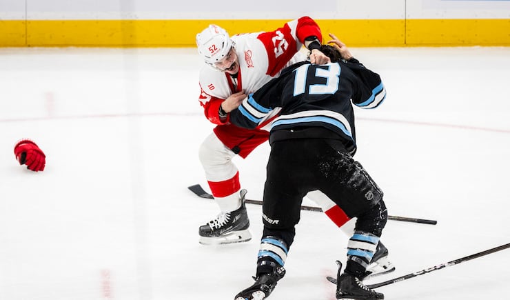 Detroit Red Wings defenseman Travis Hamonic (52) fights with Utah Mammoth left wing Brandon Tanev (13) during the second period of an NHL game held at the Delta Center in Salt Lake City on Wednesday, Feb. 4, 2026. | Isaac Hale, Deseret News