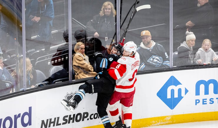 Detroit Red Wings defenseman Jacob Bernard-Docker (25) reacts after being checked by Utah Mammoth center Barrett Hayton (27) during the first period of an NHL game held at the Delta Center in Salt Lake City on Wednesday, Feb. 4, 2026. | Isaac Hale, Deseret News