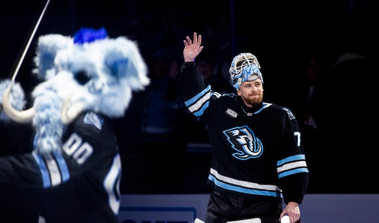 Utah Mammoth goaltender Karel Vejmelka (70) waves to the crowd during the player of the game ceremony after the Utah Mammoth’s 4-1 victory over the Detroit Red Wings at the Delta Center in Salt Lake City on Wednesday, Feb. 4, 2026. | Isaac Hale, Deseret News