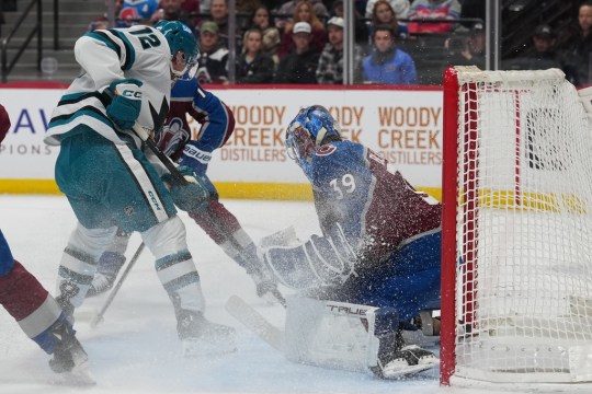 San Jose Sharks left wing William Eklund, left, puts a shot on Colorado Avalanche goaltender MacKenzie Blackwood in the second period of an NHL hockey game Wednesday, Feb. 4, 2026, in Denver. (AP Photo/David Zalubowski)