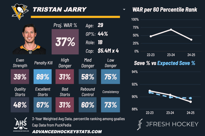 The stats show Jarry was given a tough hand. It wasn’t easy to play in front of the Penguin defense this season, that disclaimer has to be given. But even accounting for team inputs, the GSAA numbers put him towards the bottom. Keeping the puck out of the net was a real struggle.
