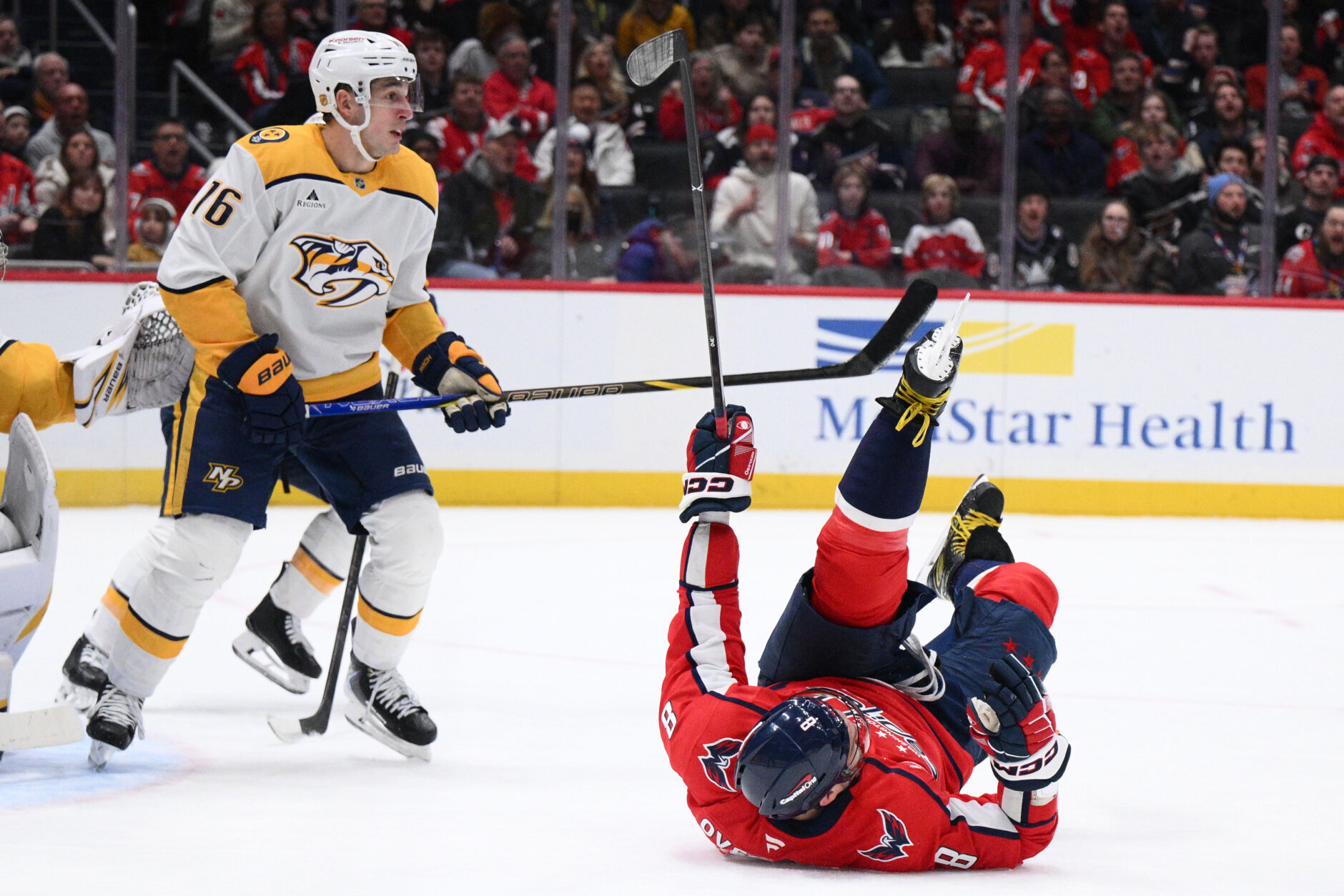 Alex Ovechkin, Brady Skjei Washington Capitals left wing Alex Ovechkin (8) falls to the ice after he was tripped by Nashville Predators defenseman Brady Skjei (76) during the first period of an NHL hockey game, Thursday, Feb. 5, 2026, in Washington. (AP Photo/Nick Wass)