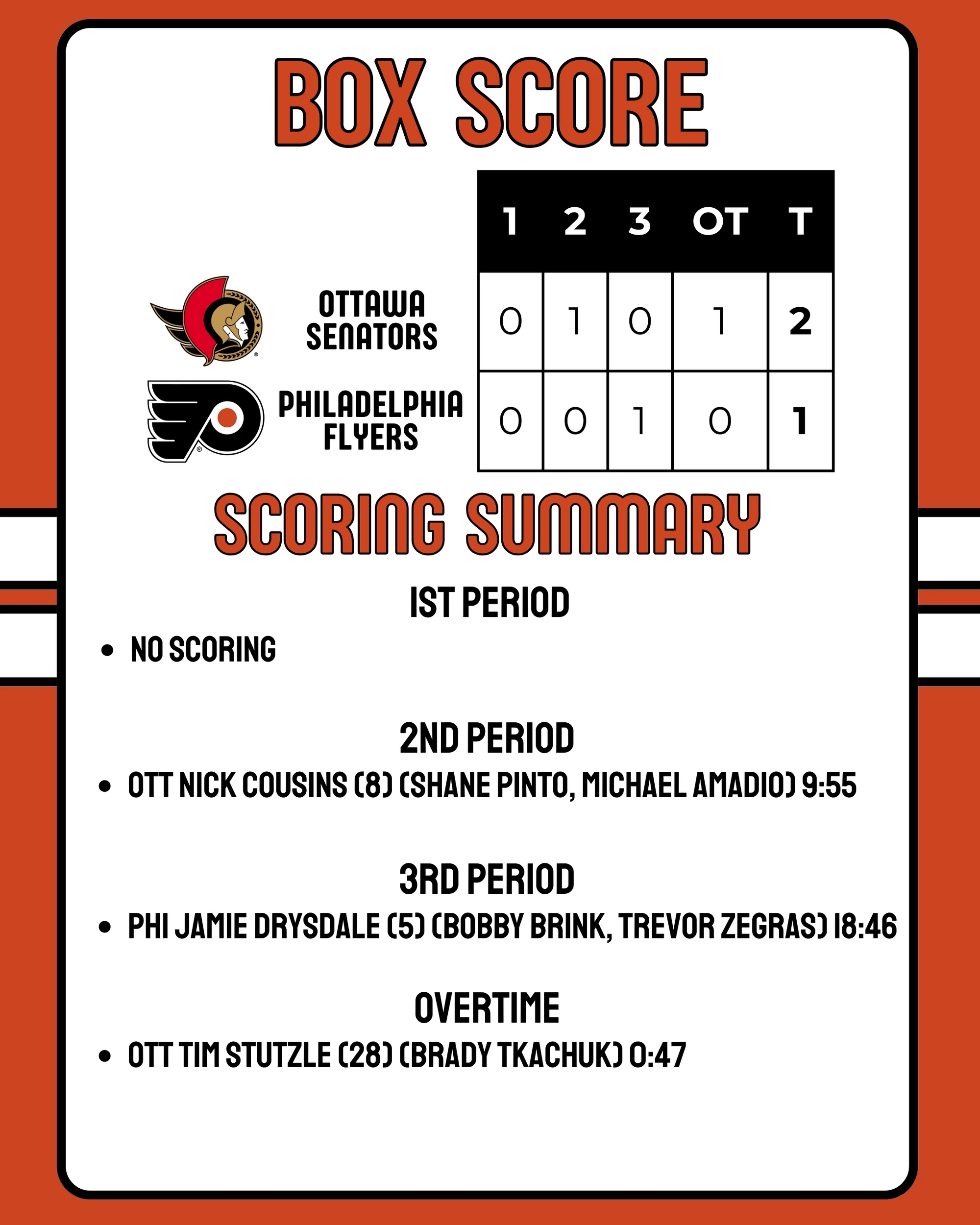 Just 47 seconds into overtime, the Senators claimed the win. A missed opportunity on a two-on-one led to a transition rush the other way. Stutzle was able to steamroll past Travis Sanheim before making the move on Dan Vladar for his 28th goal of the season.