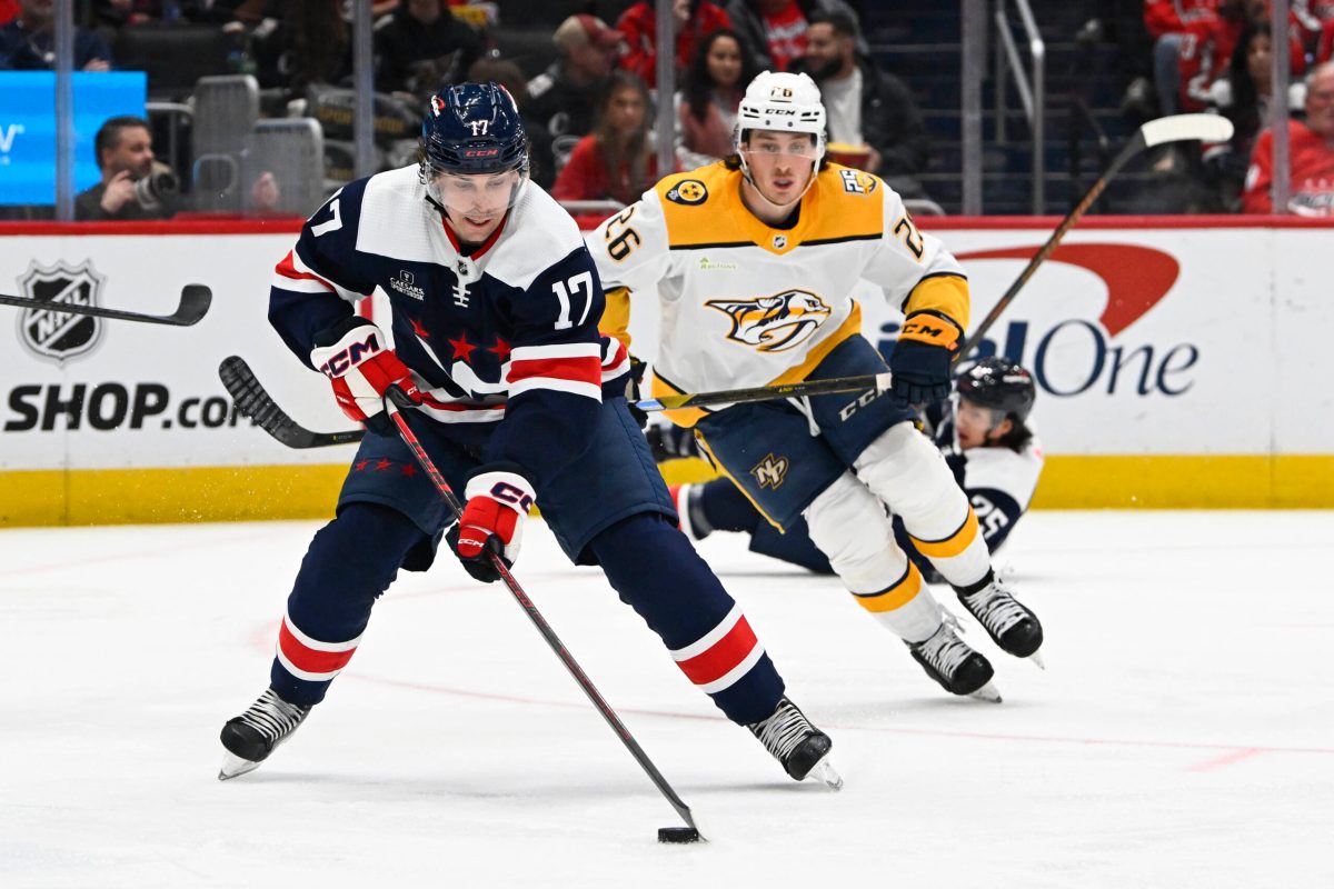 Dec 30, 2023; Washington, District of Columbia, USA; Washington Capitals center Dylan Strome (17) handles the puck as Nashville Predators center Philip Tomasino (26) chases during the second period at Capital One Arena. Mandatory Credit: Brad Mills-USA TODAY Sports
