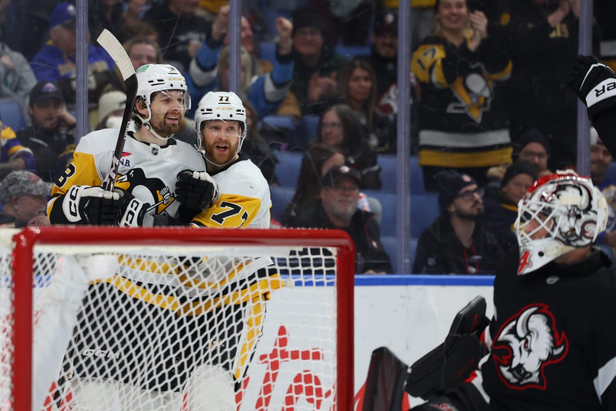 Feb 5, 2026; Buffalo, New York, USA; Pittsburgh Penguins center Tommy Novak (18) reacts after scoring goal during the third period against the Buffalo Sabres at KeyBank Center. Mandatory Credit: Timothy T. Ludwig-Imagn Images