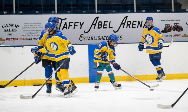 The under-14 Soo Lakers hockey team practices on Sept. 29, 2025, at the Taffy Abel Arena on the campus of Lake Superior State University in Sault Ste. Marie, Michigan. The arena, named for the Ojibwe hockey great, is the only NCAA hockey arena that has more seats (4,000) than the university has students. The Sault Tribe of Chippewa Indians donated $3 million to the renovation. Credit: Charles Fox/Special to ICT