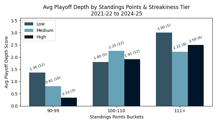 Breaking standings points into buckets and slicing them by streakiness tier produces inconsistent results. If streakiness alone drove playoff success, each standings-point bucket would show the same trend. The buckets do not show this.