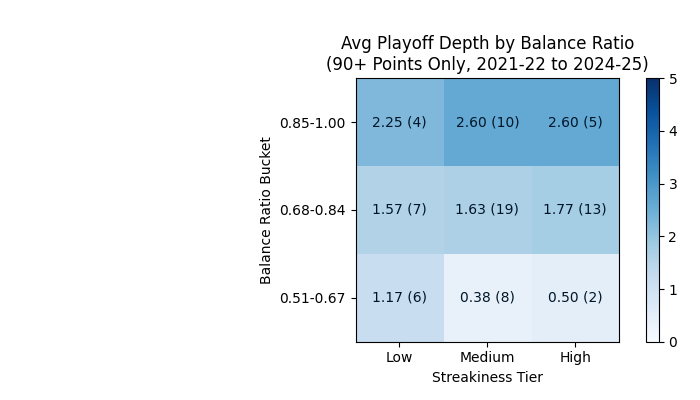 The results seem to align with intuition. Teams with higher balance ratios perform better in the playoffs. There is also a trend showing that playoff depth score improves as streakiness increases for teams above a 0.68 balance ratio.