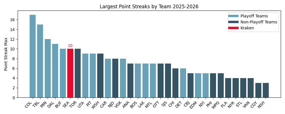 It may not feel like it at times, but Seattle has had six point streaks and only three losing streaks. That amounts to 30 games on point streaks and 14 games on losing streaks.