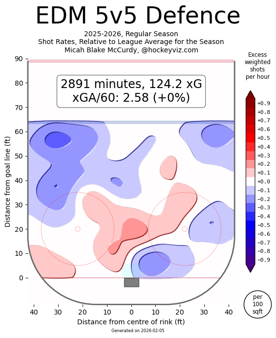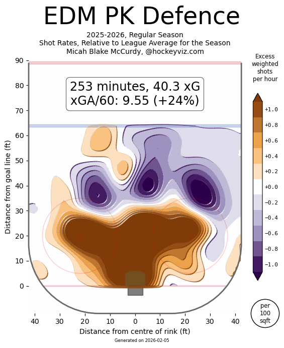 Where this is the most noticeable is in their penalty kill. Yes, the Oilers were top 12 in the league in the penalty kill before this last stretch of games, but truthfully speaking, they were super lucky to be there in the first place. All year, as you can see from the heat chart, they suck at clearing the net front, they suck at preventing the chances in the slot, they allow way too many cross-crease HD passes, and again, every single rebound/tip option available makes its way through. 40.3 xG on the penalty kill is straight up laughable. This may be the worst penalty kill in NHL history.