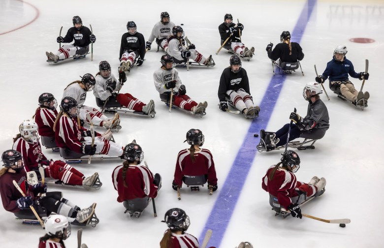 The Concord Crimson Tide girls hockey team gets used to skating on sledss during their practice at Everett Arena on Friday, February 6, 2026. Credit: GEOFF FORESTER / For the Monitor