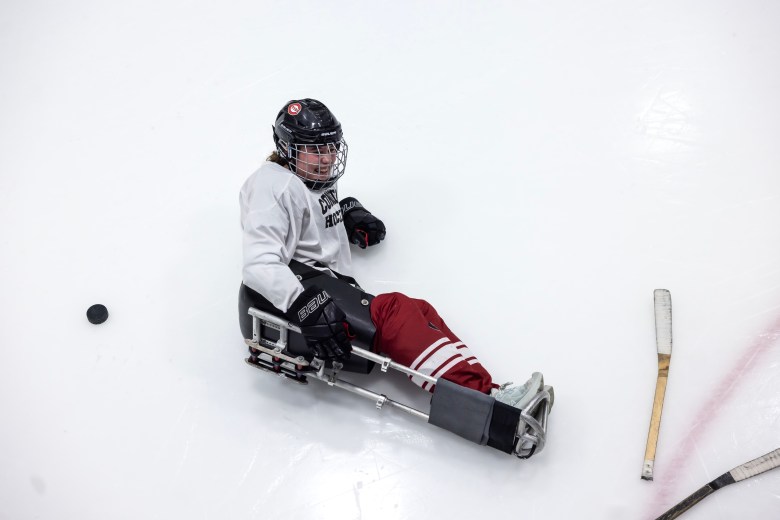 Concord hockey player Elizabeth Woods laughs as she attempts to get back up on her tipped over sled during the team’s practice with the UNH Northeast Passage program on Friday, February 6, 2026. Credit: GEOFF FORESTER / For the Monitor