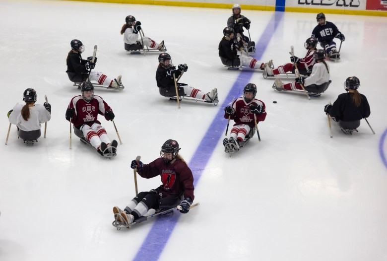 Concord hockey players left to right, Malie Ramshaw, Katelyn Fennelly, Sydney Brown and Natalie Pochopin get used to skating on sleds during the Northeast Passage demonstration at their practice on Friday, February 6, 2026. Credit: GEOFF FORESTER / For the Monitor