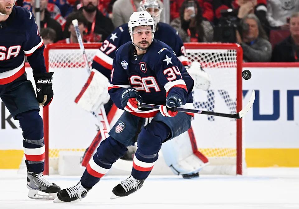 Auston Matthews #34 of Team USA plays against Team Canada during the first period in the 4 Nations Face-Off game at the Bell Centre on Feb. 15, 2025 in Montreal, Quebec, Canada.