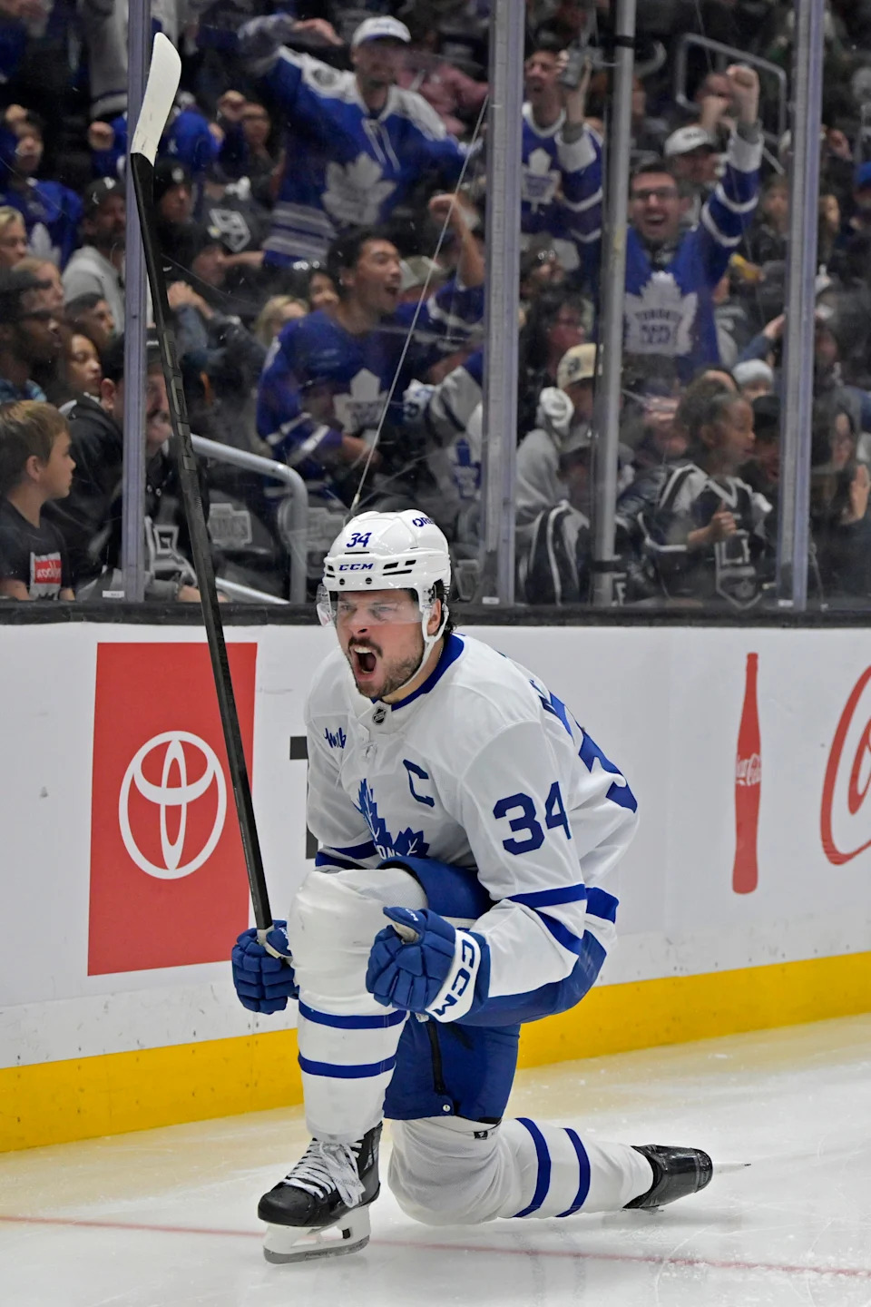 Toronto Maple Leafs center Auston Matthews celebrates after scoring the go-ahead goal in the third period against the Los Angeles Kings at Crypto.com Arena in Los Angeles on Mar. 29, 2025.