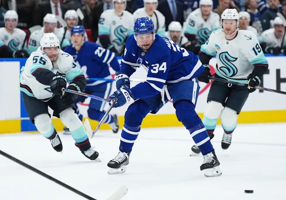 Toronto Maple Leafs center Auston Matthews (34) passes the puck defended by Seattle Kraken defenseman Ryan Lindgren (55) during the first period at Scotiabank Arena in Toronto on Oct. 18, 2025.
