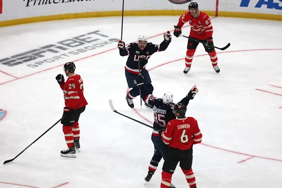 Auston Matthews #34 of Team United States celebrates Jake Sanderson #85 of Team United States goal against Jordan Binnington #50 of Team Canada during the second period in the NHL 4 Nations Face-Off Championship Game at TD Garden on Feb. 20, 2025 in Boston, Mass.