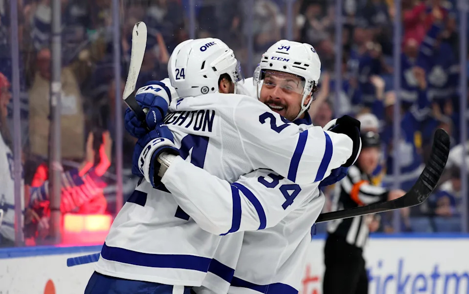 Toronto Maple Leafs center Auston Matthews (34) celebrates his 400th career NHL goal on an empty net with left wing Scott Laughton (24) during the third period against the Buffalo Sabres at KeyBank Center in Buffalo on April 15, 2025.