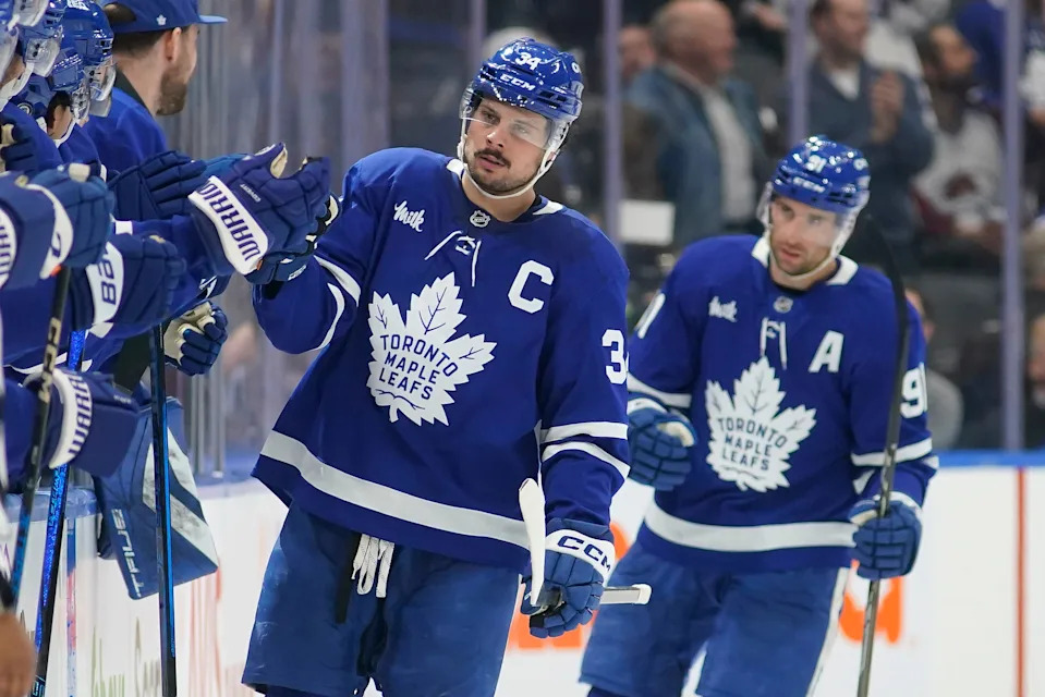 Toronto Maple Leafs forward Auston Matthews (34) gets congratulated after scoring against the Colorado Avalanche on an assist by Toronto Maple Leafs forward John Tavares (91) during the second period at Scotiabank Arena on March 19, 2025.