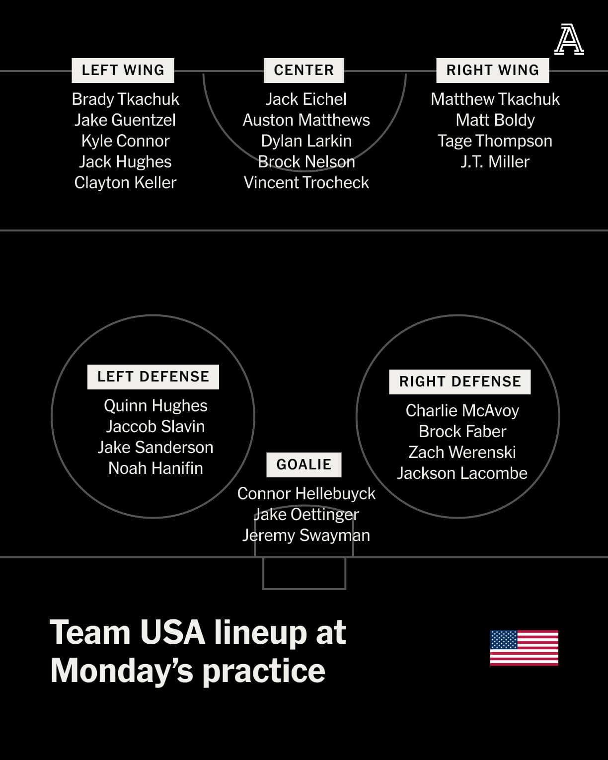 The U.S. also may have provided an inside peek at its power-play units. Quinn Hughes quarterbacked the first unit with Auston Matthews, Kyle Connor, Matthew Tkachuk and Tage Thompson on Monday, and the second unit consisted of Jake Guentzel, Jack Hughes, Brady Tkachuk, Clayton Keller and Jackson Lacombe.