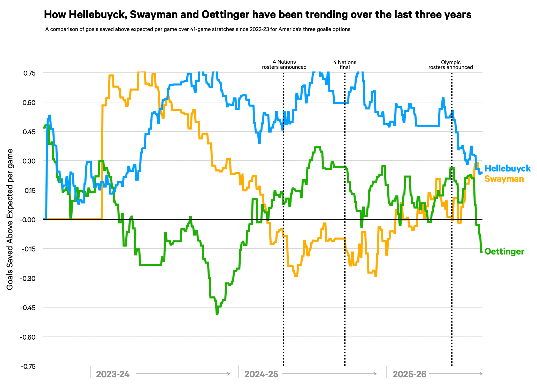 What makes this a tough call is that Swayman, who didn’t get playing time in the 4 Nations, may arguably be playing better this season than Hellebuyck and Oettinger.