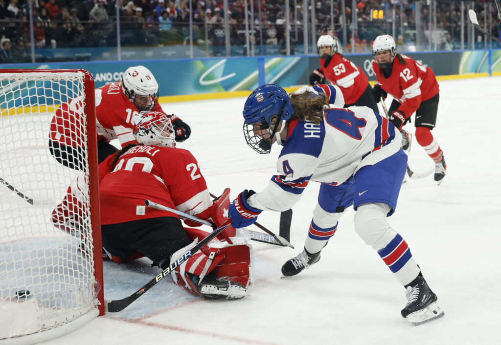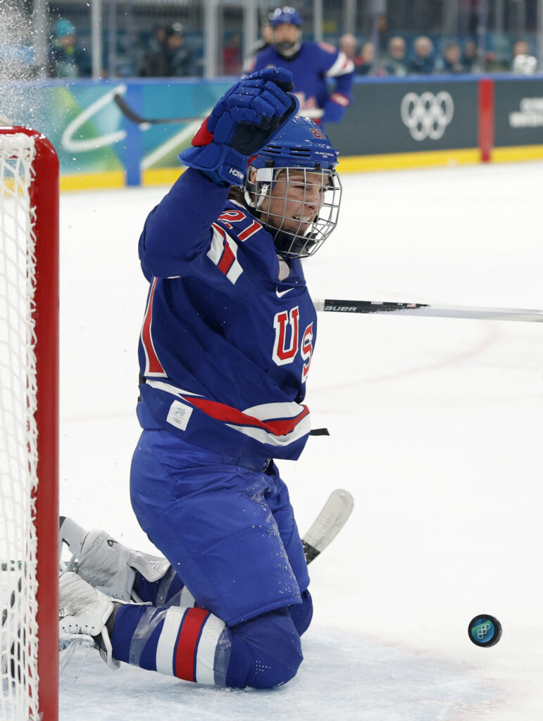 Feb 9, 2026; Milan, Italy; Caroline Harvey of United States scores their fifth goal against Switzerland in women’s ice hockey group A play during the Milano Cortina 2026 Olympic Winter Games at Milano Santagiulia Ice Hockey Arena. Mandatory Credit: Geoff Burke-Imagn Images