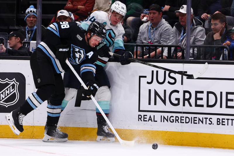 Utah Mammoth defenseman Mikhail Sergachev (98) hits Seattle Kraken right wing Kaapo Kakko (84) into the boards during NHL game at the Delta Center in Salt Lake City on Saturday, Jan. 17, 2026. | Rio Giancarlo, Deseret News