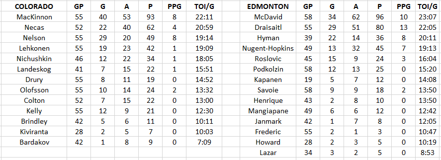 Colorado has five forwards playing 18+ minutes a night and Edmonton has four.