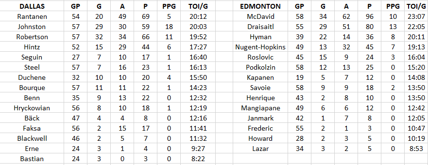 Dallas has three forwards playing 18+ min and Edmonton has four.
