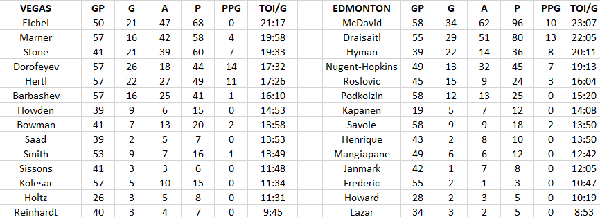 Vegas has three forwards at 18+ minutes to the Oilers four.