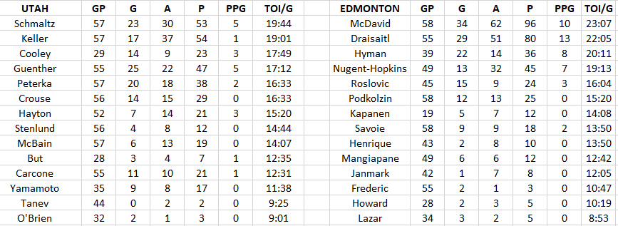 The remaining Utah forwards have scored 35 EV/PK goals and five PP goals compared to the Oilers 28 EV/PK and two PP goals.