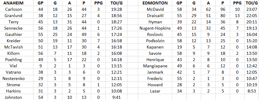 The Ducks’ top six are equal to Edmonton at EV/PK with 84 goals each, but Edmonton has a 41-21 advantage on the PP.